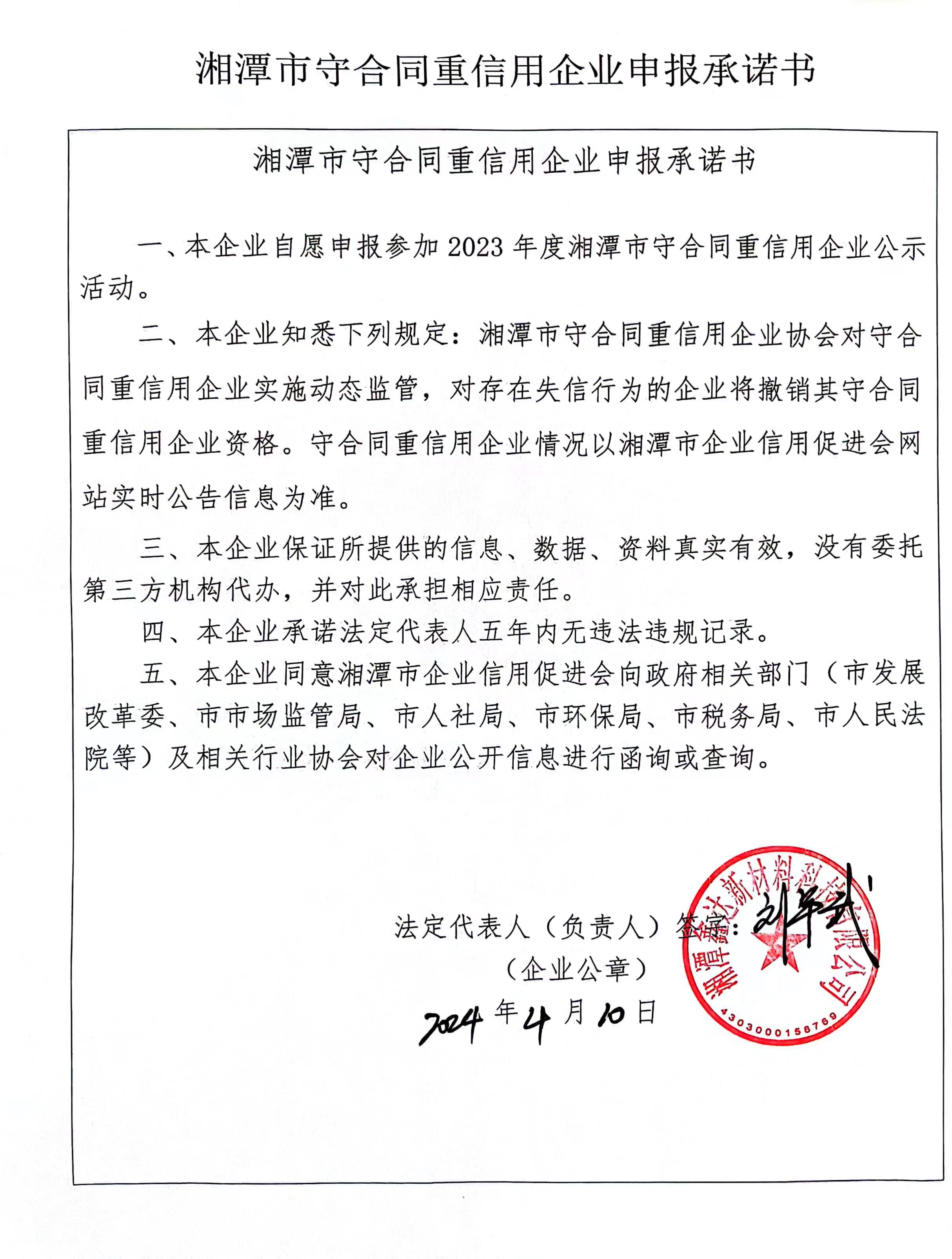 本企業(yè)根據(jù)《湘潭市守合同重信用企業(yè)申報(bào)規(guī)定》等編制 2023 年度企業(yè)信用報(bào)告書,并保證本報(bào)告書內(nèi)容真實(shí)、準(zhǔn)確、完整。