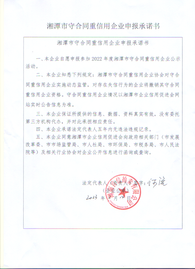本企業(yè)根據(jù)《湘潭市守合同重信用企業(yè)申報(bào)規(guī)定》等編制 2022 年度企業(yè)信用報(bào)告書(shū),并保證本報(bào)告書(shū)內(nèi)容真實(shí)、準(zhǔn)確、完整。