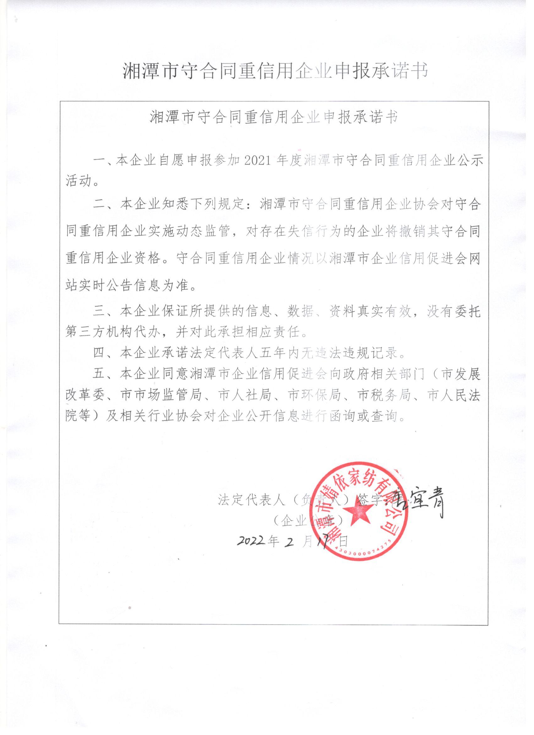 本企業(yè)根據(jù)《湘潭市守合同重信用企業(yè)申報規(guī)定》等編制 2021 年度企業(yè)信用報告書,并保證本報告書內(nèi)容真實、準(zhǔn)確、完整。