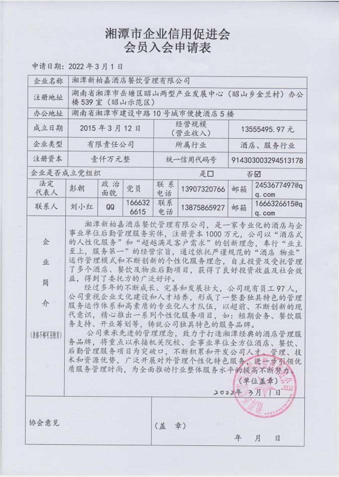 名稱: 湘潭新柏嘉酒店餐飲管理有限公司 登記證號(hào): 914303003294513178 法定代表人: 彭朝